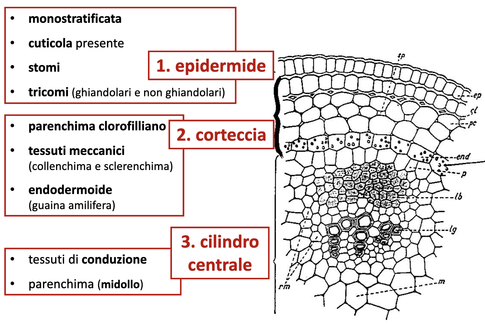 | Corteccia | Meristema fondamentale | Parenchima clorofilliano, tessuti meccanici, endodermoide |