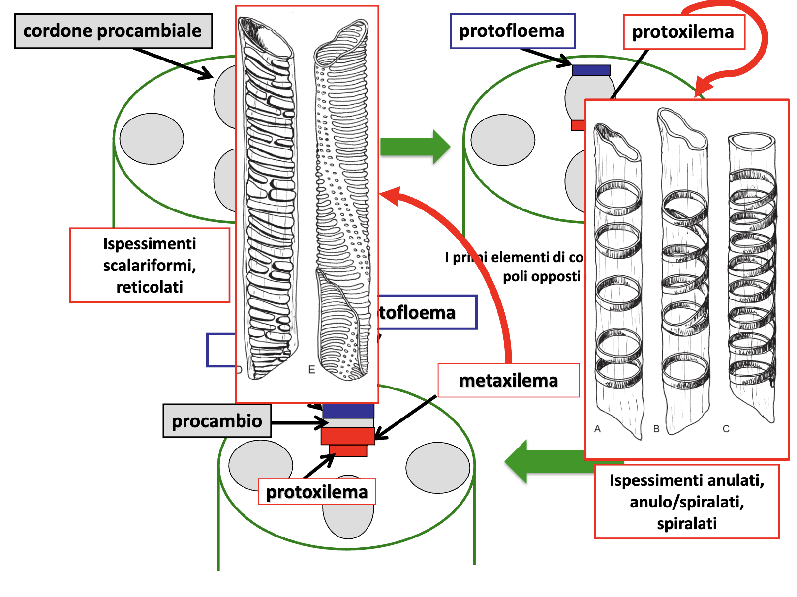- Protoxilema: tracheidi anulate/spiralate (diametro piccolo)