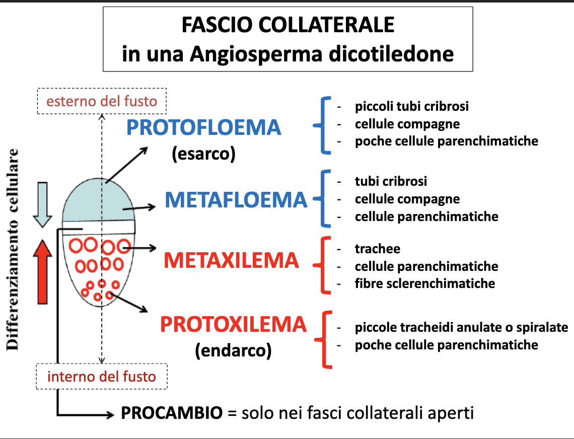 | Dicotiledoni/Gimnosperme | Anello regolare | Collaterali aperti | Eustele |