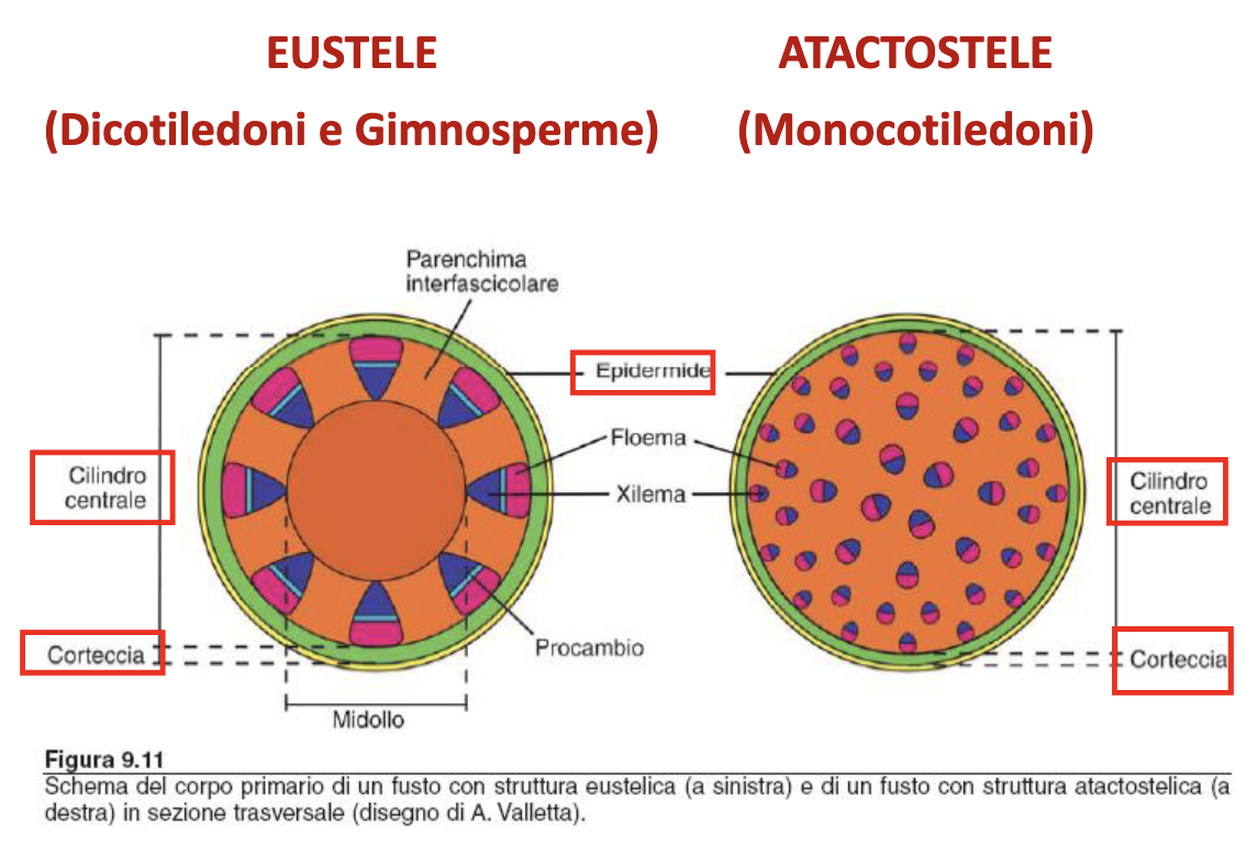| Monocotiledoni | Disordinata (tutto cilindro) | Collaterali chiusi | Atactostele/Atassostele |